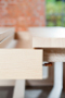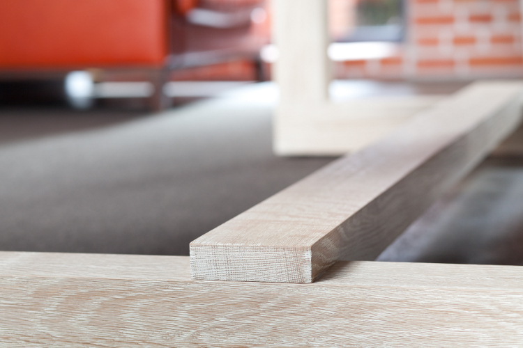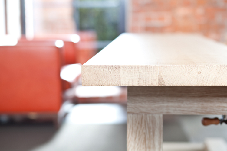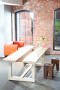 Die kubistische Form und seine einmalige Funktionalität zeichnen diesen Esstisch aus Eiche-Vollholz aus. Neben dem gekalkten Fußgestell besticht die Tischplatte durch ihre Vielseitigkeit.