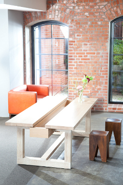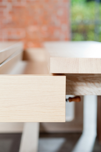Als Besonderheit lassen sich die beiden Tischhälften zur Seite auseinanderziehen, wodurch ein Kastenfach freigegeben wird, das zur Aufbewahrung von Tischutensilien dienen oder für Dekorationsarrangements verwendet werden kann.